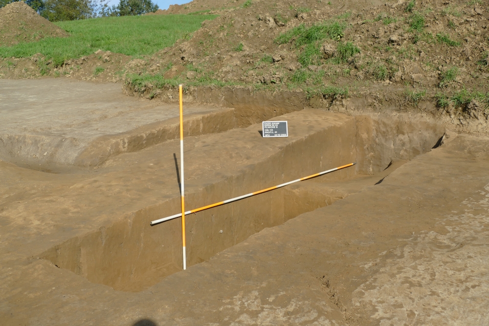 Die jüngste Verfüllung (SE 54) aus einem sehr dunkelgrau-braunen sandigen Schluff mit einigen Keramikfragmenten und gebrochenen Flussgeschieben hat sich ähnlich wie die oben erwähnte SE 56 erst lange nach dem Siedlungsende abgelagert.