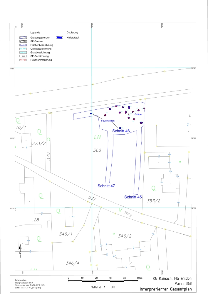 Im Frühjahr 2025 wurde der Kulturpark Hengist von der Firma Kohlbacher GmbH mit der Durchführung eines Oberbodenabtrages auf der Parzelle 368 in der KG Kainach (MG Wildon) beauftragt. Das Grundstück liegt südlich der Kainachtalstraße, die das im Jahr 2004 entdeckte und seither in mehreren Grabungskampagnen archäologisch untersuchte spätmittelbronze- bis älterhallstattzeitliche Kainacher Bestattungsareal (Gutjahr 2011a, 141–206; Gutjahr 2011b, 207-218; Gutjahr 2015, 173–193; Gutjahr und Windholz 2017, D56–D62; Gutjahr und Windholz 2020, 241–268; Gutjahr und Trausner 2019, D5722–5726; Gutjahr und Mandl 2023, 12-13; Gutjahr und Windholz-Konrad 2024, 629–678) von West nach Ost durchschneidet. Nachdem gleich zu Beginn der Maßnahme mehrere Grabgruben freigelegt worden waren, ging der Oberbodenabtrag in eine archäologische Grabung über. Insgesamt konnten 14 älterhallstattzeitliche Brandbestattungen (Grab 275 bis Grab 288) sowie die südwestliche Grenze der Kainacher Nekropole dokumentiert werden.