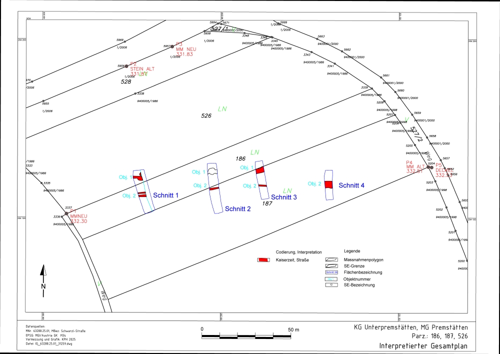 Bei dem Oberbodenabtrag auf den Parzellen 186, 197 und 526 in der Gemeinde Premstätten konnten die Reste von Straßengräben (Obj. 1 und 2) einer Ost-West orientierten römischen Nebenstraße nachgewiesen werden. Diese führte im Osten direkt auf den römischen vicus von Kalsdorf zu. Vermutlich verband die Straße diesen mit einer bisher noch nicht nachgewiesenen villa rustica im Westen des Grazer Feldes.