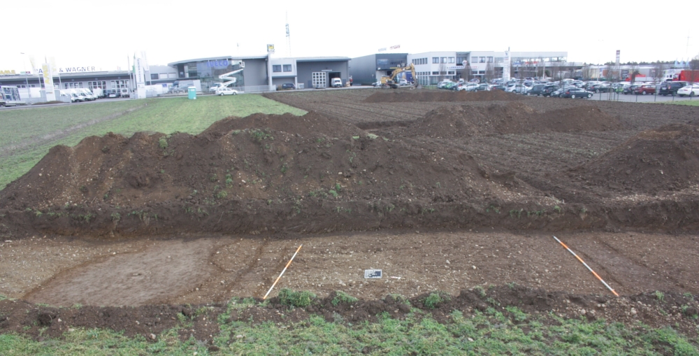 Im Vorfeld der Eingliederung der Grundstücke in den Gewerbepark wurde der Kulturpark Hengist im Frühjahr 2025 mit der Durchführung eines Oberbodenabtrages beauftragt. In den dafür mittels maschinellen Abhubes angelegten Schnitten (Schnitt 1 bis 4) konnten mehrere Ost-West verlaufende lineare Verfärbungen festgestellt werden, die in einem nördlichen (Obj. 1) und einem südlichen Graben (Obj. 2) zusammengefasst wurden. Von dem Straßenkörper selbst war nichts erhalten geblieben, die Gräben waren in den sterilen Schotter (SE 8) eingetieft worden und lagen in einem Abstand von 6 bis 6,5 m zueinander. Die Gräben waren mit dunkelbraunem, sandigem Lehm (SE 4, 6 und 13) und graubraunem Schluff (SE 12) verfüllt. Beim nördlichen Graben variierte die Breite zwischen 1,5 und 3,6 m, die max. erhaltene Tiefe betrug 0,46 m. Die Grenzen des südlichen Grabens verliefen zum Teil sehr diffus. Die Breite lag zwischen 1 m und 3,2 m und wies eine Tiefe von bis zu 0,40 m auf. Beide Gräben sind als mehrphasig einzustufen.