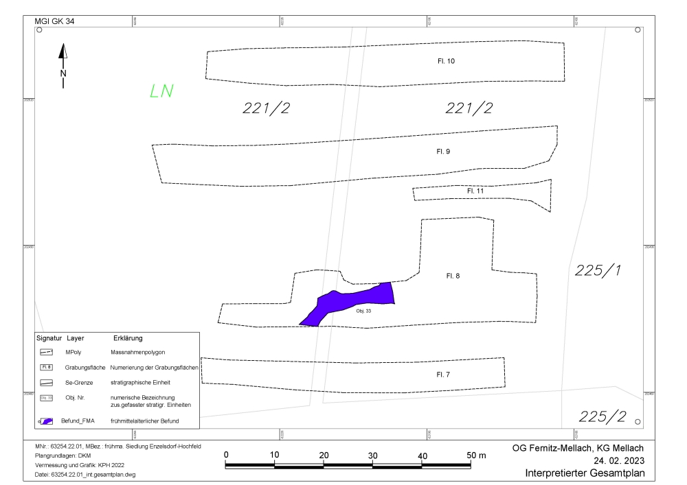 Das Hochfeld in Enzelsdorf (Gem. Fernitz-Mellach) ist durch mehrere Ausgrabungskampagnen in den letzten Jahrzehnten (1998, 2014, 2020) als frühmittelalterliche Siedlungsstelle belegt (Gutjahr 2015, 73–91; Gutjahr 2018, 45–46; Gutjahr 2020, 68–70; Gutjahr und Mandl 2022, 381; Gutjahr in Druck). Trotz der nur recht kleinflächig erfolgten Untersuchungen zählt das Hochfeld zu den bedeutendsten frühmittelalterlichen Siedlungsplätzen in der Steiermark, insbesondere für den Zeitraum der zweiten Hälfte des 7. und der ersten Hälfte des 8. Jahrhunderts. Ausdehnung und Funktion der Siedlung sind nach wie vor ungeklärt. Bei der diesjährigen Grabungskampagne wurden eine seichte Grube und ein bereits bei der Grabungskampagne 2020 angeschnittener anthropogen veränderter Bereich untersucht. Die Ost-West orientierte Grube (Obj. 35) mit den Maßen 3,5 x 1,4 m lag auf einer landwirtschaftlich genutzten Terrasse. Das Objekt wies größtenteils eine Tiefe von nur 0,15 auf, im östlichen Drittel lag die Sohle 0,22 m unter der erhaltenen Oberkante. Die Verfüllungen (SE 138, SE 141‑142) enthielten wenige stark verrollte Keramikfragmente mit löchriger Oberfläche und zwei Spinnwirtel. Der Befund lässt sich zwar eindeutig der frühmittelalterlichen Siedlung zuordnen, aufgrund des schlechten Erhaltungszustandes konnte aber keine Aussage zur Funktion und ursprünglichen Größe der Grube (Hausrest?) gemacht werden. Gut 100 Meter nördlich davon wurde 2020 im Bereich eines sanft nach Süden abfallenden Hanges eine dunkle Verfärbung (Obj. 12, 17 x 8 m) aufgenommen, die aufgrund Zeitmangels nicht mehr ausreichend untersucht werden konnte. Da die Fläche 2023 nicht zugänglich war, die Verfärbung (Obj. 12) aber in die östlich angrenzende Parzelle reichte, wurden dort zwei kleine Schnitte (Schnitte 12 und 14) geöffnet.