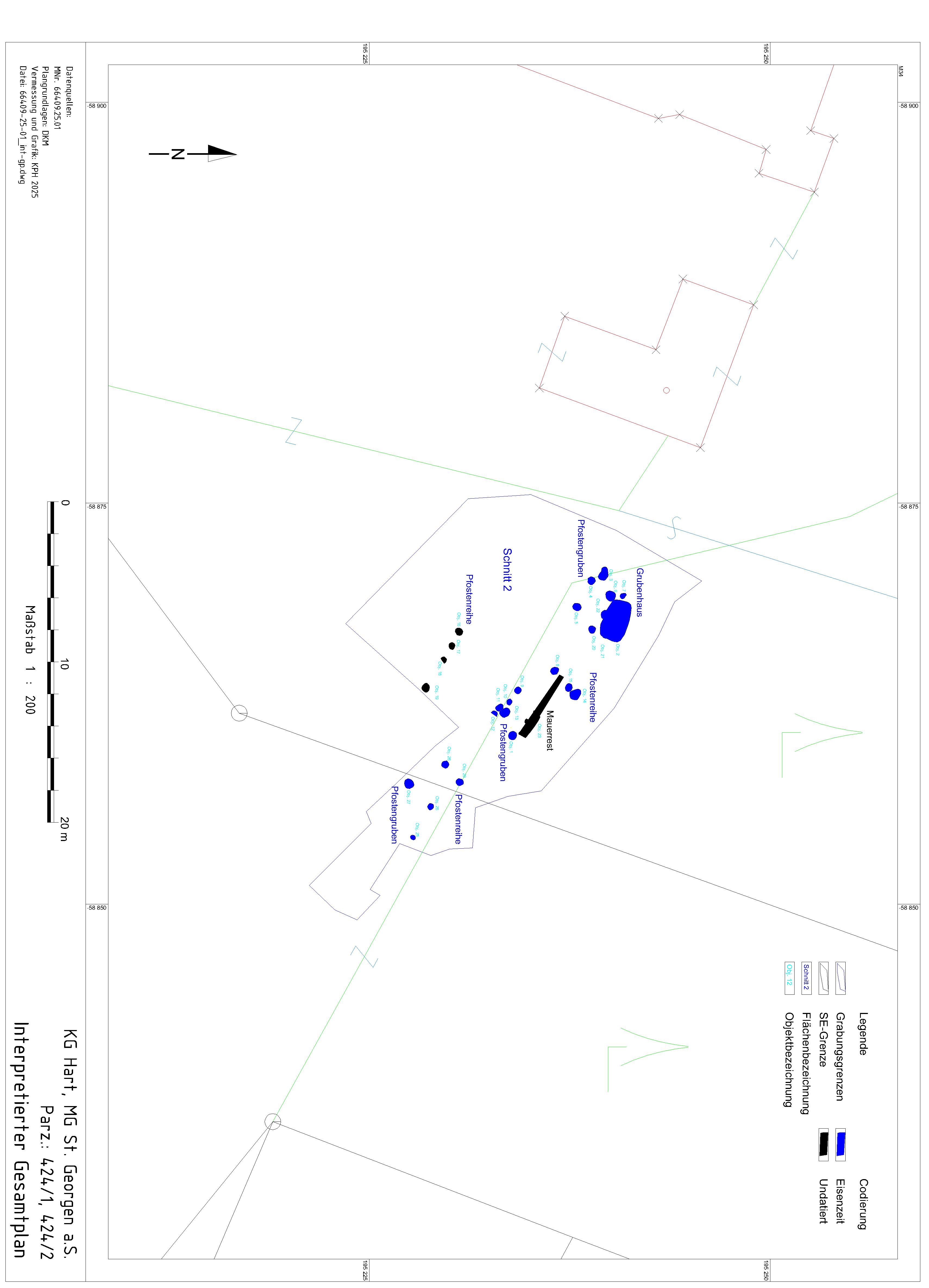 Die Errichtung eines Erweiterungsbaues für die im Schloss Neudorf (EBNER 1981, 122–123) in St. Georgen an der Stiefing untergebrachte Fachschule für Land- und Ernährungswirtschaft (Auftraggeber Landesimmobilien Gesellschaft mbH und Amt der Steiermärkischen Landesregierung Abteilung 16 / Referat Landeshochbau) erforderte eine baubegleitende archäologische Untersuchung. Sie erfolgte von 4. bis 6. August sowie am 25. September 2025 auf den im Südosten an das Schloss anschließenden Parzellen 424/1 und 424/2 und umfasste eine Maßnahmenfläche von insgesamt 660 m2. Im Zuge des maschinellen Humusabtrages zeigte sich sehr schnell, dass nur auf einem die nördliche Geländekante randlich begleitenden, leicht erhöhten Geländestreifen archäologische Siedlungsbefunde erhalten geblieben waren, die sich auf eine Fläche von 285,40 m2 beschränkten. Der südöstliche Bereich der Maßnahmenfläche war in der Vergangenheit durch Geländeumwälzungen und Materialabtragungen bereits so stark beeinträchtigt worden, dass schon unter dem Humus der gewachsene Boden zum Vorschein kam.