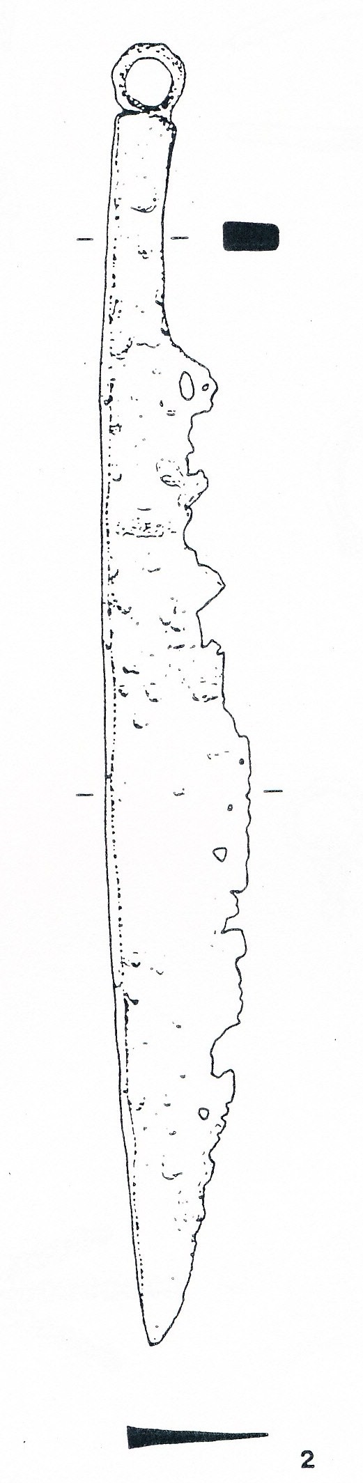 UMJ-Inv.Nr. 16696: Ringgriffmesser (Haumesser); Eisen; L. 47,40 cm; KlingenL. ca. 36 cm; KlingenB. 5,30 cm; Messerrücken 0,90 cm; RingDm. 2,70 cm; Gew. 440,20 g; Geschenk 1957 von Anton Holl; mittlere–späte Latènezeit (Lt C/D; 250–15 v. Chr.); siehe Modrijan, SchvSt 8, 8.